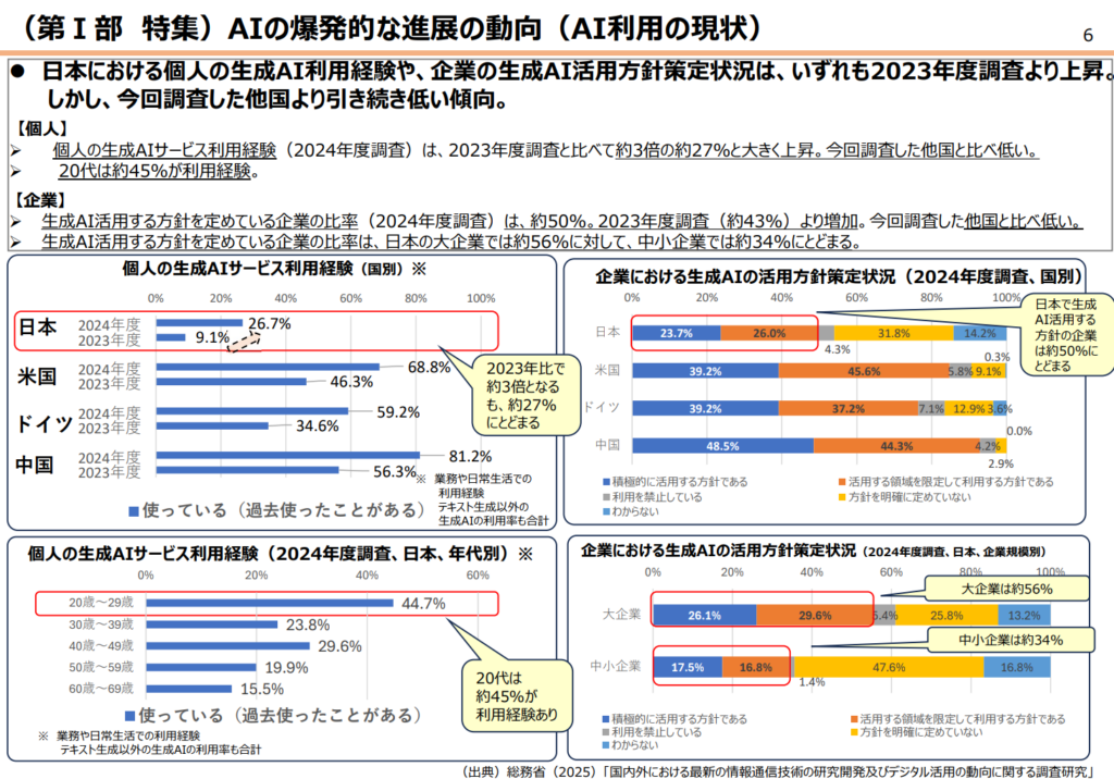 AI技術の急速な進化はビジネスに大きな変革をもたらしていますが、多くの企業、特に中小企業ではAIの具体的な活用方針が不明確なため、従業員個人の判断に委ねられている現状があります。総務省「情報通信白書 令和7年版」によると、生成AIの活用方針を定めている日本企業は2024年度で約50%にとどまり、他国と比較して低い水準です。特に中小企業では約34%と、大企業の約56%に比べて整備の遅れが目立ちます。