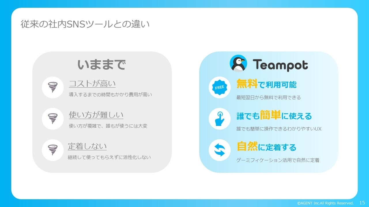 悩みの9割、職場ストレス原因の第1位は人間関係であり、幸福度を高めるのは年収、仕事、家庭ではなく、良好な人間関係と言われています。また昨今のコロナウイルス感染症に対応する上で働き方もリモートワークが当たり前となったことで、組織のコミュニケーションが減少し、エンゲージメントの低下に悩む企業も少なくありません。実際7割以上の企業が社内コミュニケーション課題を感じており、退職理由の多くが人間関係を理由としているという調査結果も出ております。そこで社員同士の繋がりを強化することだけに特化した社内SNSを開発し、“はたらく”を、“なかよく”することを通じて、日本の職場を“あかるく”して、生産性とQOL向上に貢献できないかと思い立ちました。