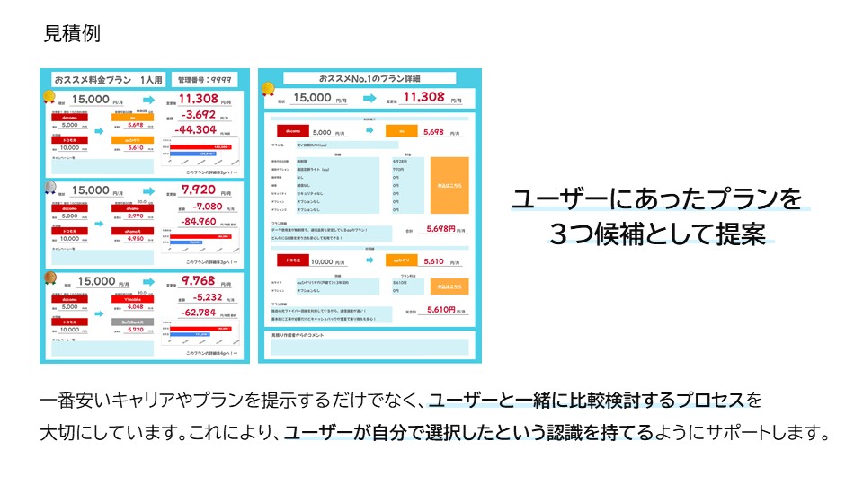 - 中立提案:特定キャリアに依存しない15種類のプランから最適なプランをご提案。不要な勧誘は行いません。