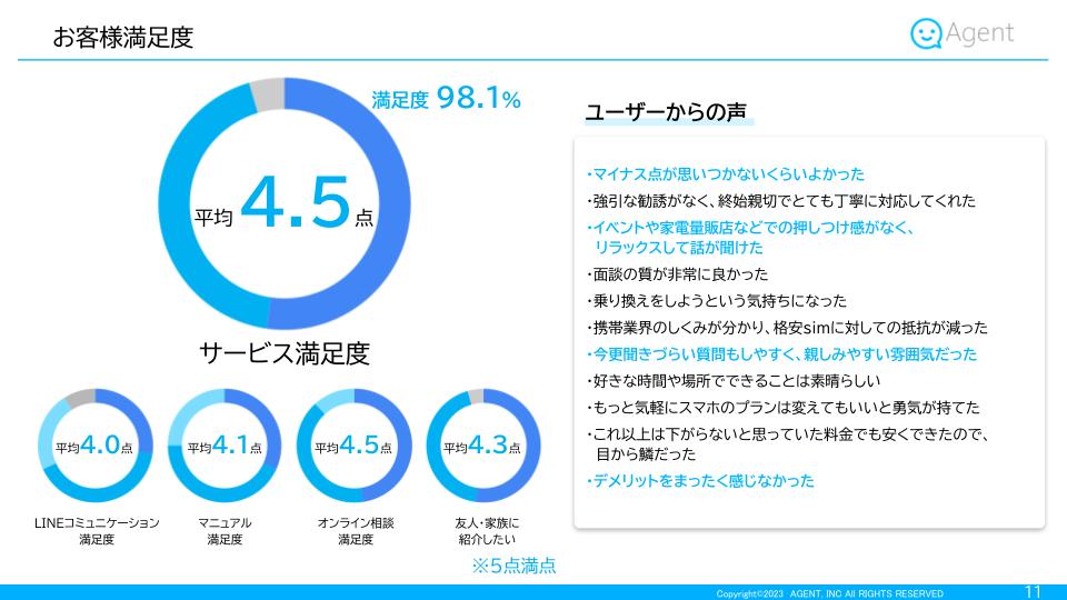5点満点の評価で平均4.5点、満足度98.1%を達成。